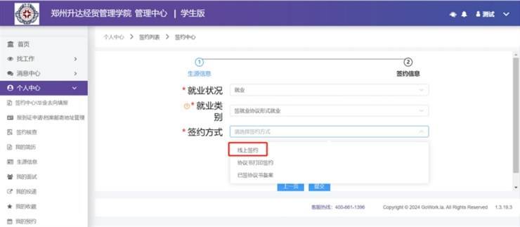 3.完善生源信息之后,选择【就业状况】—【就业】、【就业类别】—【签就业协议形式就业】,选择【签约方式】—【线上签约】。