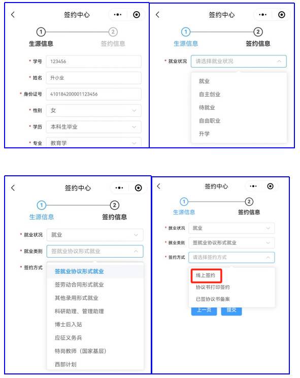 3.完善生源信息后,选择【就业状况】—【就业】、【就业类别】—【签就业协议形式就业】、【签约方式—【线上签约
