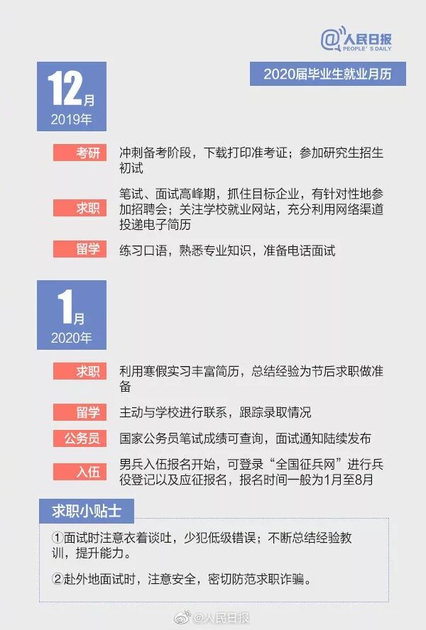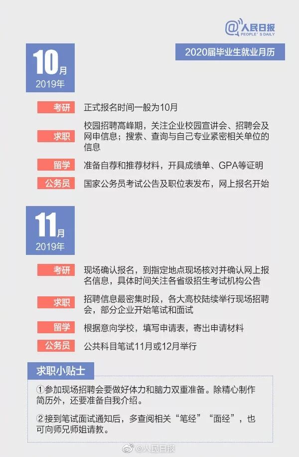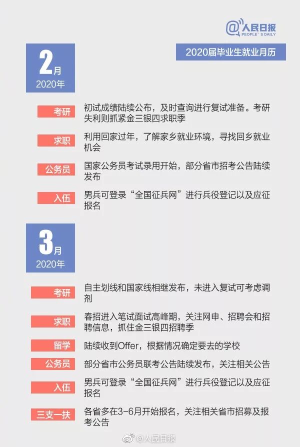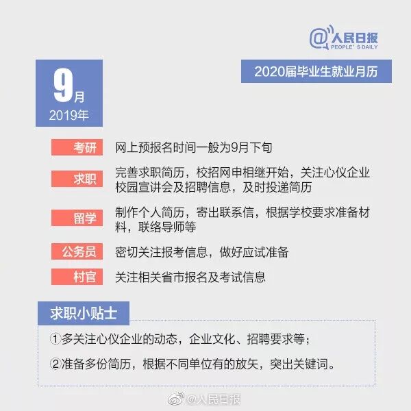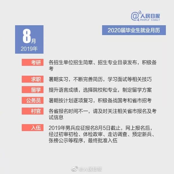 随着2019届毕业生陆续踏入工作岗位,2020届准毕业生也将开启新一轮的求职历程。暑假一过,新学期就开始了,考研、就业还是出国,你考虑好了吗?不打无准备之仗,2020届毕业生升学求职月历已帮你备好“就业党”“考研党”“出国党”,速收!